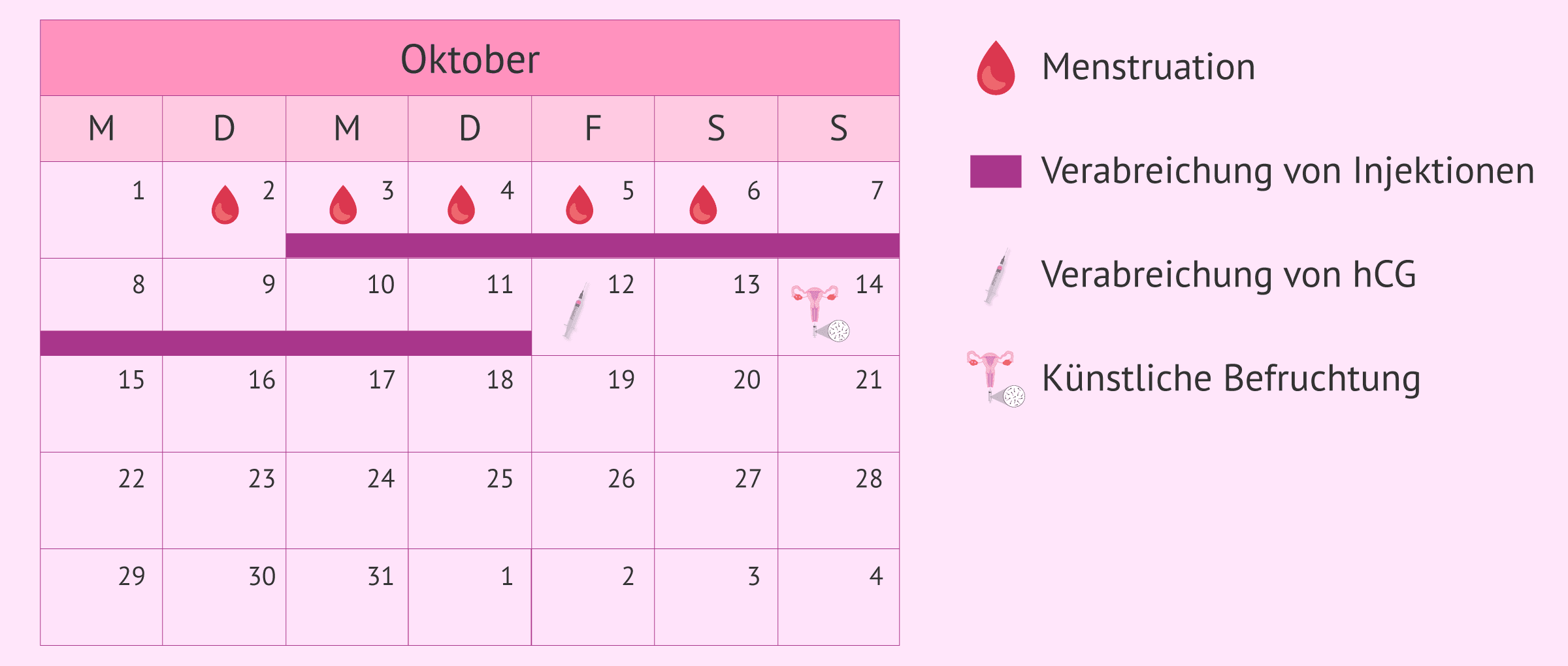 Zu diesem Zweck beginnt das KOS-Protokoll für die Insemination mit der Verabreichung von Injektionen zwischen dem zweiten und dritten Tag der Menstruation. Die Dauer dieser Phase im Inseminationsprozess beträgt in der Regel etwa 8-14 Tage, in denen sich die Patientin verschiedenen ärztlichen Kontrollen unterzieht.