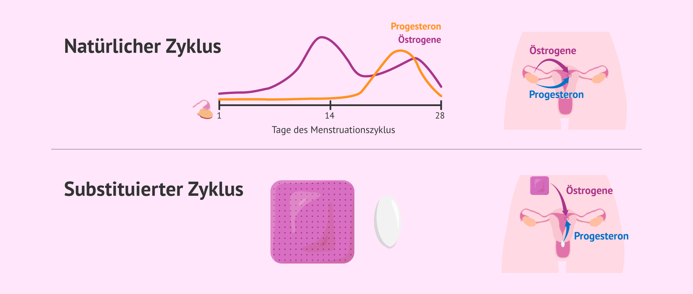 Andererseits besteht der substituierte Zyklus (künstliche Zyklus) darin, das Endometrium durch die Verabreichung von Östrogenen und Progesteron mittels hormoneller Medikamente vorzubereiten.