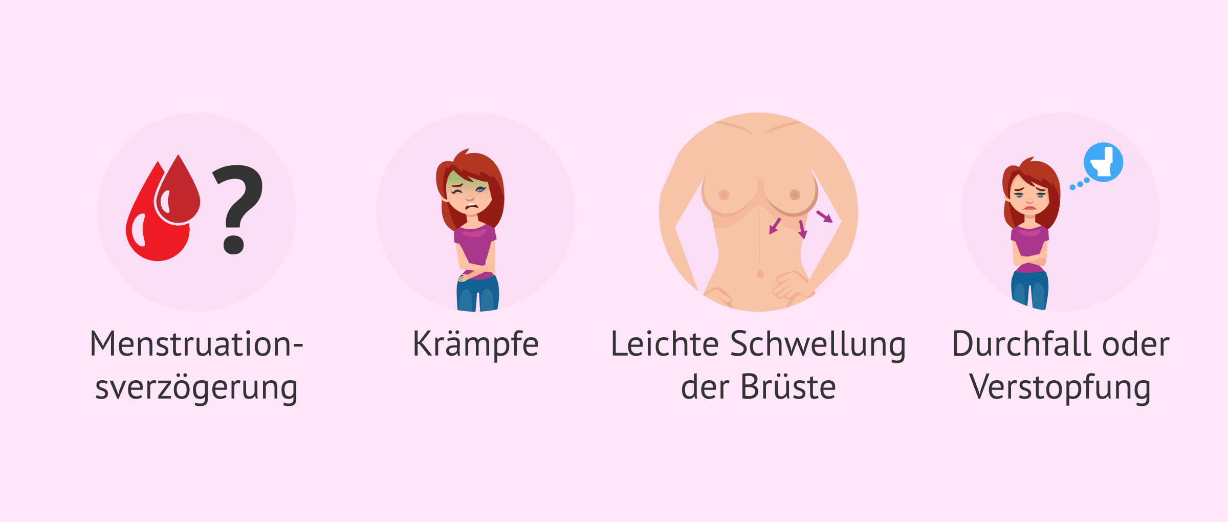 Ausbleiben der Menstruation (Menstruationsverzögerung), Müdigkeit, Übelkeit, Verstärkter Harndrang, Durchfall (Diarrea), etc.