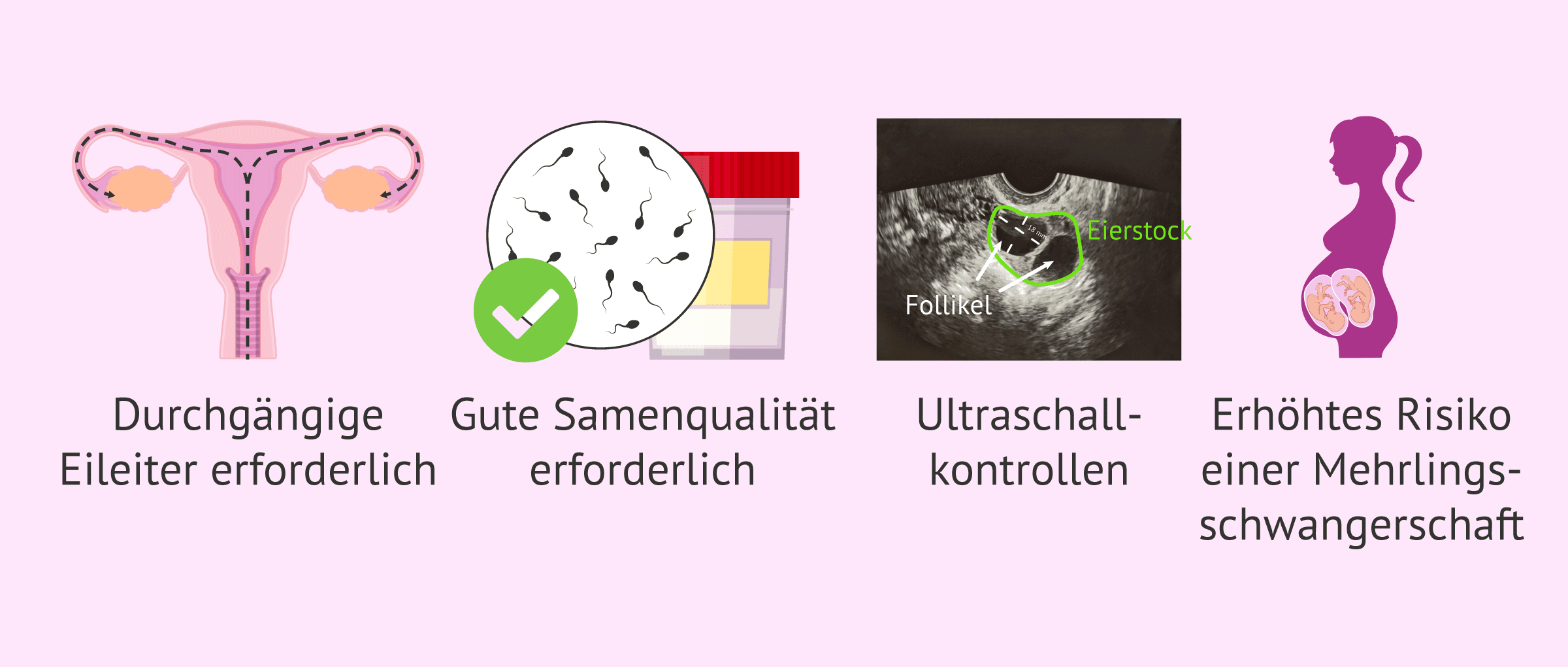 Für eine IUI ist es notwendig, dass die Eileiter durchgängig sind. Andernfalls können die Spermien die Eizelle nicht erreichen, um sie zu befruchten. Außerdem muss der Samen von guter Qualität sein und die Spermien müssen sich vorwärts bewegen (progressiv motil sein).